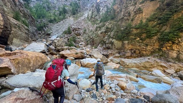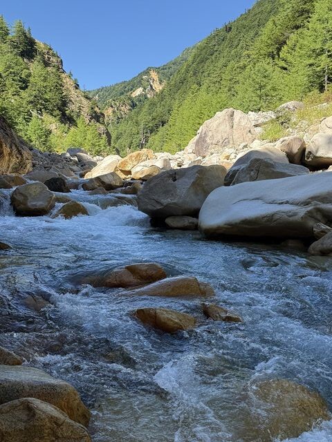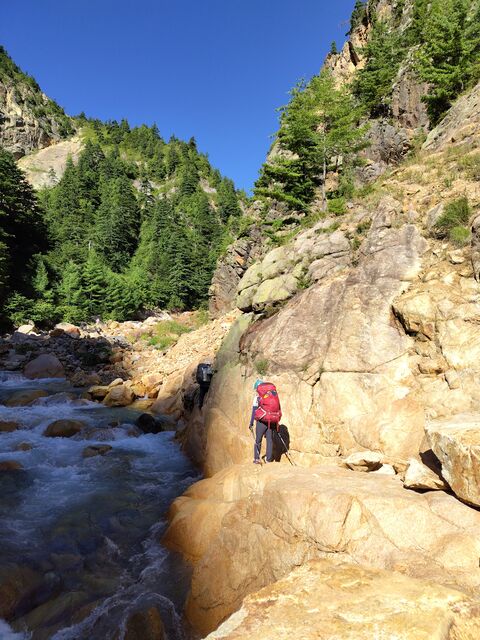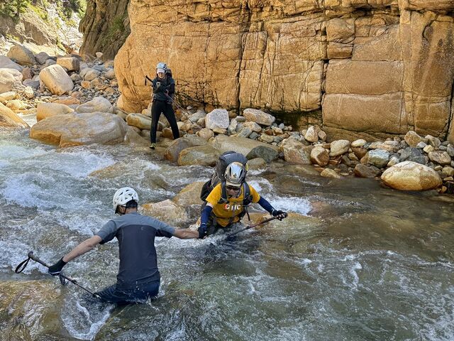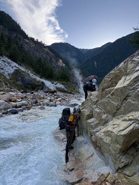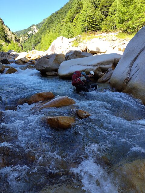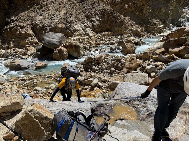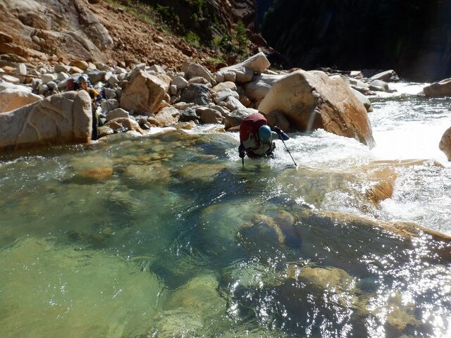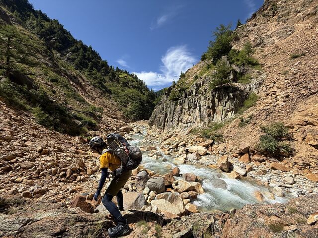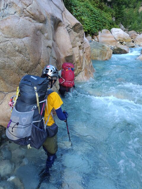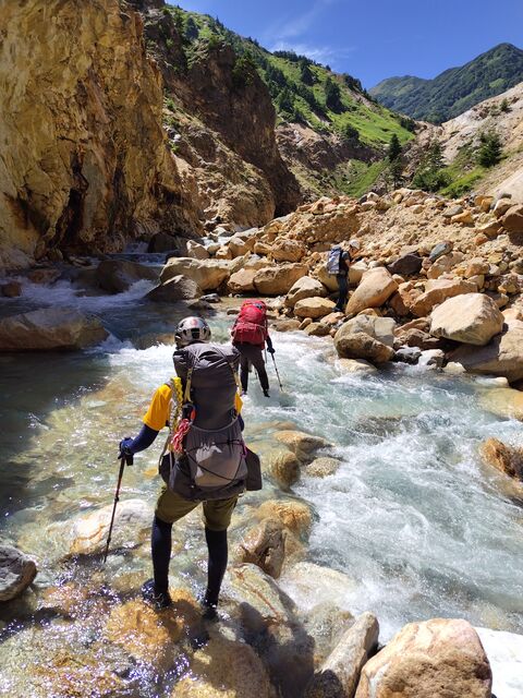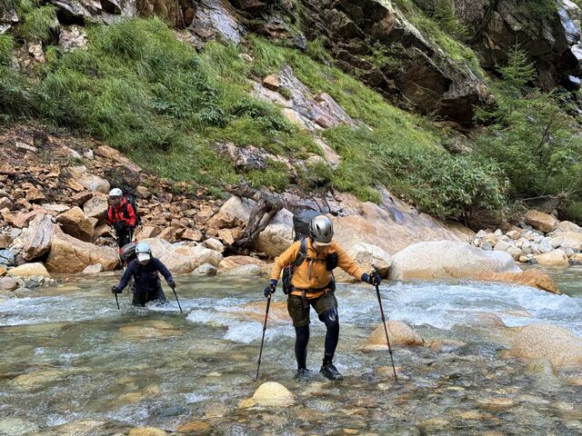 大雪や豪雨の影響か川床が大岩を残し深く掘られているのでスクラム渡渉には向かない箇所がほとんど。