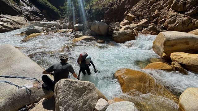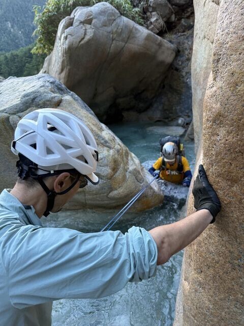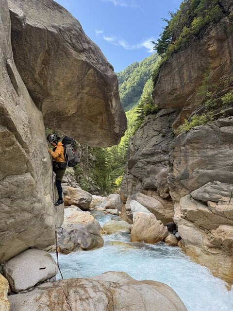 身長差もあり私でヘソ下でも小柄な女性だと胸下くらいになる箇所もあるので注意が必要、小柄な方は減水している時に入渓するか、水位がやや高い時はロープ等で確保してもらうと安心だ。