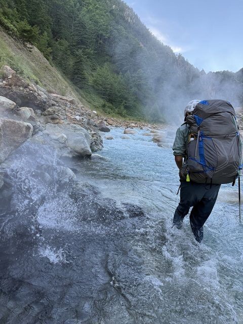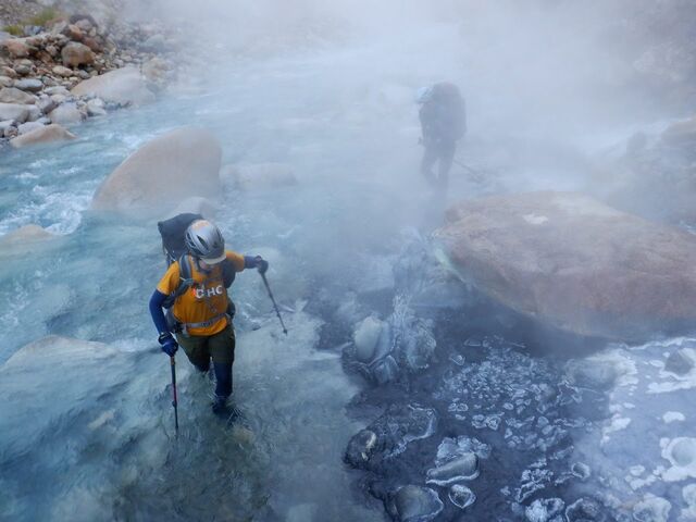 沢に復帰、噴気地帯を遡行、メガネが曇る。