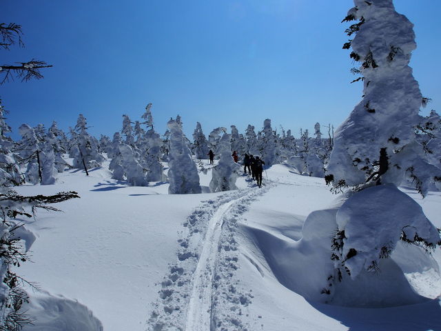 今回はたまたま晴れ、しかも前日に吹雪いていたので真っ白な見事な樹氷原が見られました。